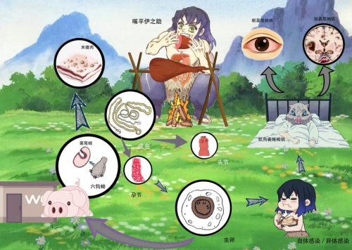 作品简介:人既是猪带绦虫的唯一终宿主,亦可作为其中间宿主,而猪是猪带绦虫的主要中间宿主。本作品通过带猪头像的日本动漫人物“嘴平伊之助”的不良饮食习惯来表现了猪带绦虫的生活史及其引起的严重囊虫病。“伊之助”食用了未烤熟的米猪肉后感染了猪带绦虫成虫,成虫寄生于人体小肠,孕节成熟后随粪便排出体外。孕节和虫卵污染水和草可感染猪,也可经异体感染或自体感染方式经口感染人体,寄生不同部位组织,发育为囊尾蚴造成囊虫病。囊虫病对人类的危害很严重。以此图来警示人们注意个人饮食卫生,杜绝食用未经烤熟的猪肉。