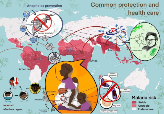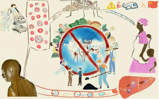 作品简介:1.本作品引用“全球疟疾分布图”和“疟疾杂志”封面图中的黑人孕妇和儿童形象,用写实和概要的手法描绘了恶性疟原虫在人体肝脏和红细胞内的生活史、传播媒介-按蚊体内的生活史以及人体感染后的发热等临床表现。2.还有绘图世界地图周边附有冉冉升起的绿色青蒿做为“守护”,描绘了一幅全世界人们共同抗疟的景象。3.从国外输入性疟疾,用红色箭头来表达,治好疟疾的外国人回国以蓝色箭头来表达,表示中国医护人员防止疟疾再传播守护人类健康的能力和决心。