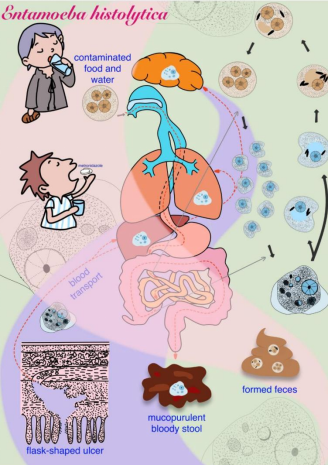 作品简介:本作品描绘了溶组织内阿米巴的生活史:1.在人体内,从四核包囊经口感染、到结肠大量增殖小滋养体或大滋养体,肠功能正常时最终以包囊形式随成型粪便排出体外。2.阿米巴痢疾急性期滋养体在结肠壁引起典型“烧瓶状”肠溃疡,大滋养可随坏死组织脱落进入肠腔随巧克力色水样便排出体外或也可随血流移行到肝肺脑等组织器官引起的肠外阿米巴病。3.溶组织内阿米巴病是世界范围内的公共卫生问题,本作品意在治疗该疾病的同时,我们要加强健康教育,粪便无害化处理,保护水源,搞好环境卫生,以提高自我保护能力。