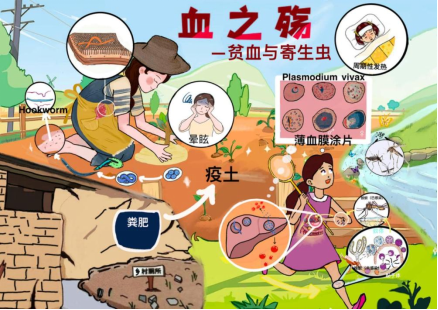 作品简介:作品展现了导致贫血的主要寄生虫——钩虫和疟原虫。图中1.乡村茅厕所中产生的粪肥携带钩虫卵进入农作物土地,妇女在菜地劳作时通过接触疫土中丝状蚴导致经皮肤感染钩虫,图中2.疟疾流行区女孩在外玩耍时被按蚊叮咬感染间日疟原虫,此图同时展现钩虫病和疟疾的典型贫血临床症状,引起人们的重视,加强健康教育,以提高自我保护能力。