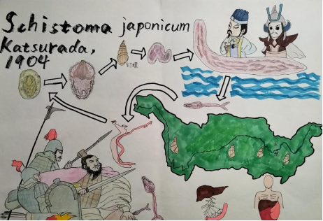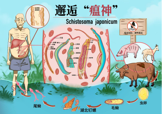 本图借此典故描绘日本血吸虫的生活史,并反应长江流域该虫的泛滥及历史悠久。