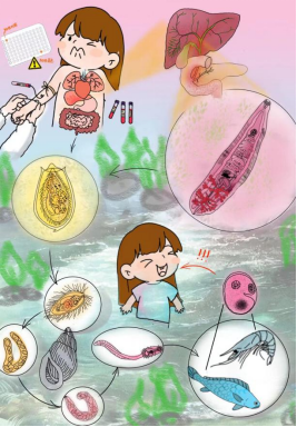 作品简介:本作品描绘了肝吸虫的生活史,感染期及致病和诊断方法。