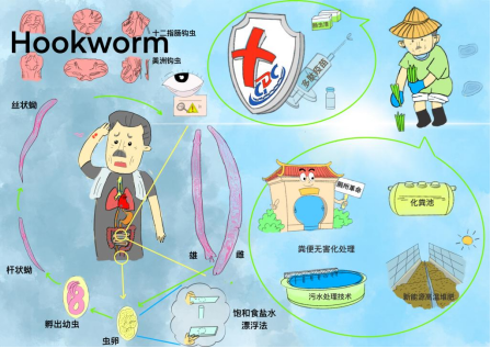 作品简介:本作品描绘了钩虫的生活史,钩虫幼虫在人体内的移行过程,以及钩虫导致了严重贫血。图中介绍了钩虫的诊断方法——饱和盐水漂浮法,以及钩虫的基本防治方法。