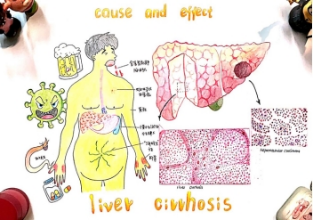 (手绘作品:《肝硬化的前因后果》、作者:21级临床医学专业 贾斯琪、指导老师:谭晓华)
