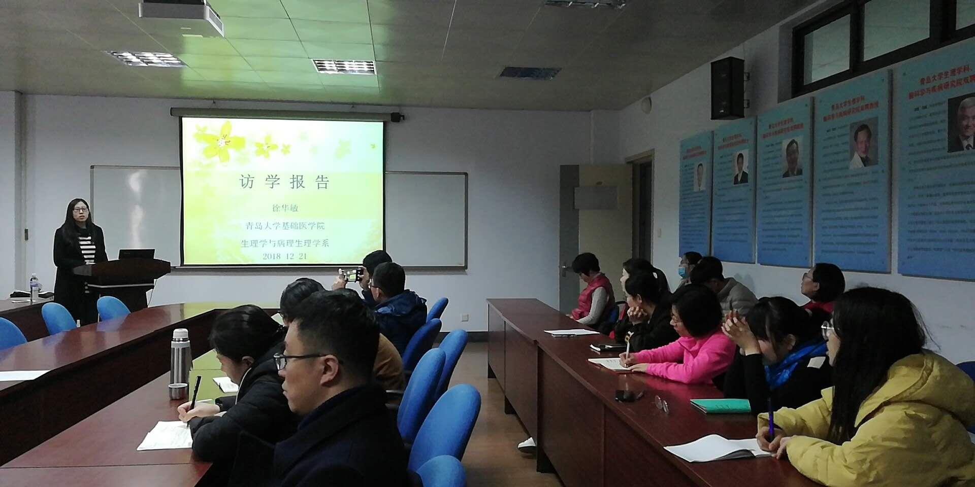 徐华敏教授作了《加拿大渥太华大学访学汇报》的报告,她首先介绍了自己的出国出境访学经历和加拿大渥太华的文化生活体验,随后介绍了在渥太华大学访学的学习、研究情况及其在渥太华大学的访学成果。在成果报告中,详细介绍光遗传技术(optogenetics)的原理及在神经科学中的应用,并展示了应用光遗传学技术在睡眠及觉醒的神经环路研究及脑缺血后抑郁的神经环路研究中取得的部分实验结果。最后围绕自己访学过程的所学所感,讲述了自己的心得体会。