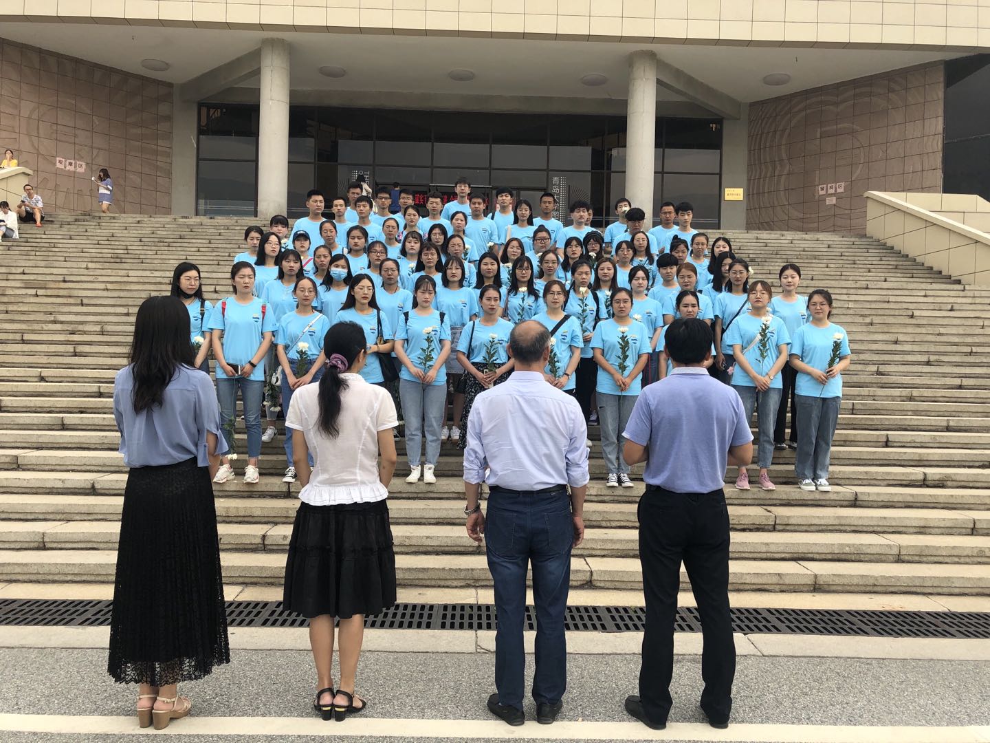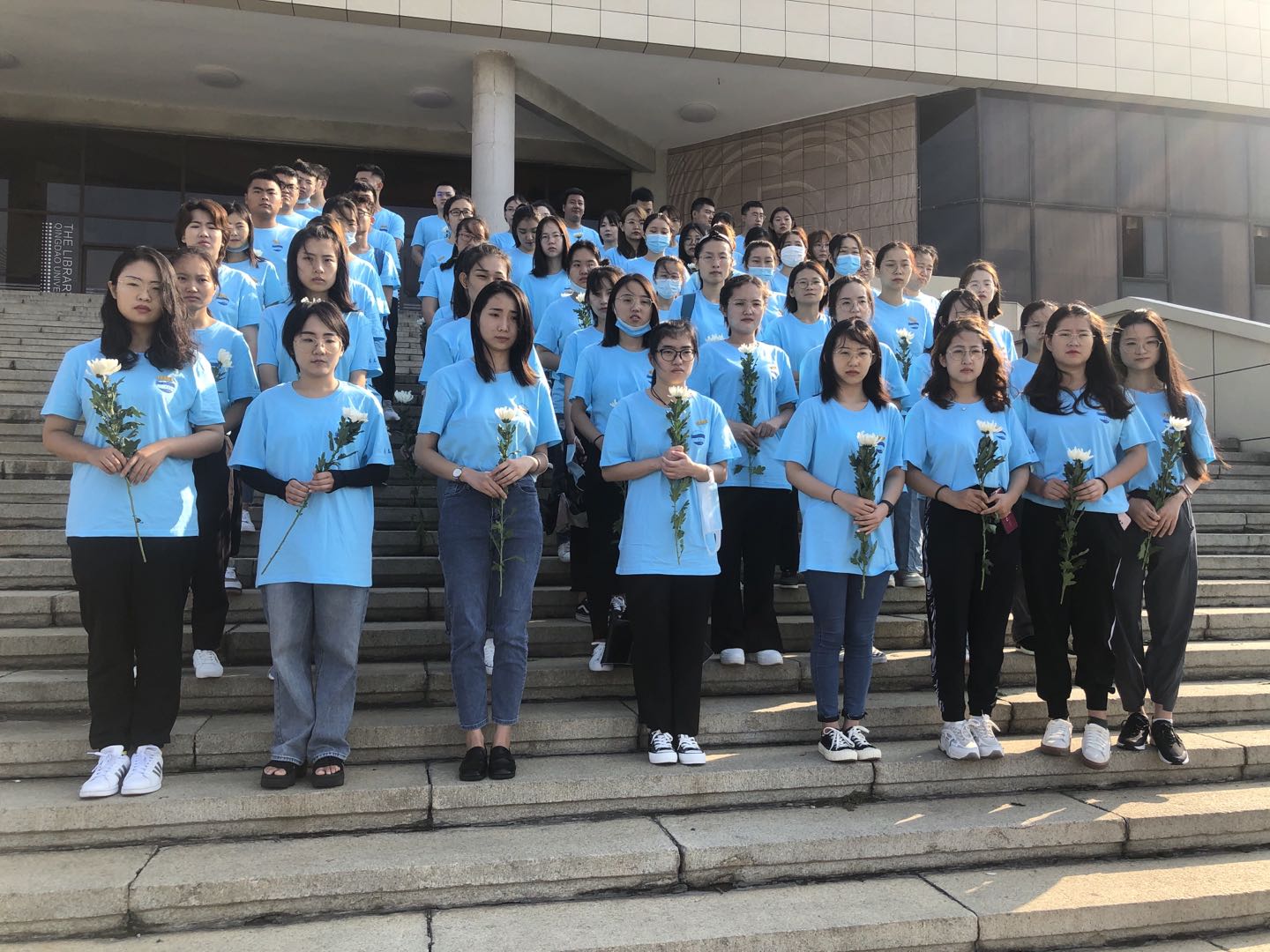 2020级硕士一班全体同学身着文化衫,佩戴校徽,手持菊花,在图书馆前集合。