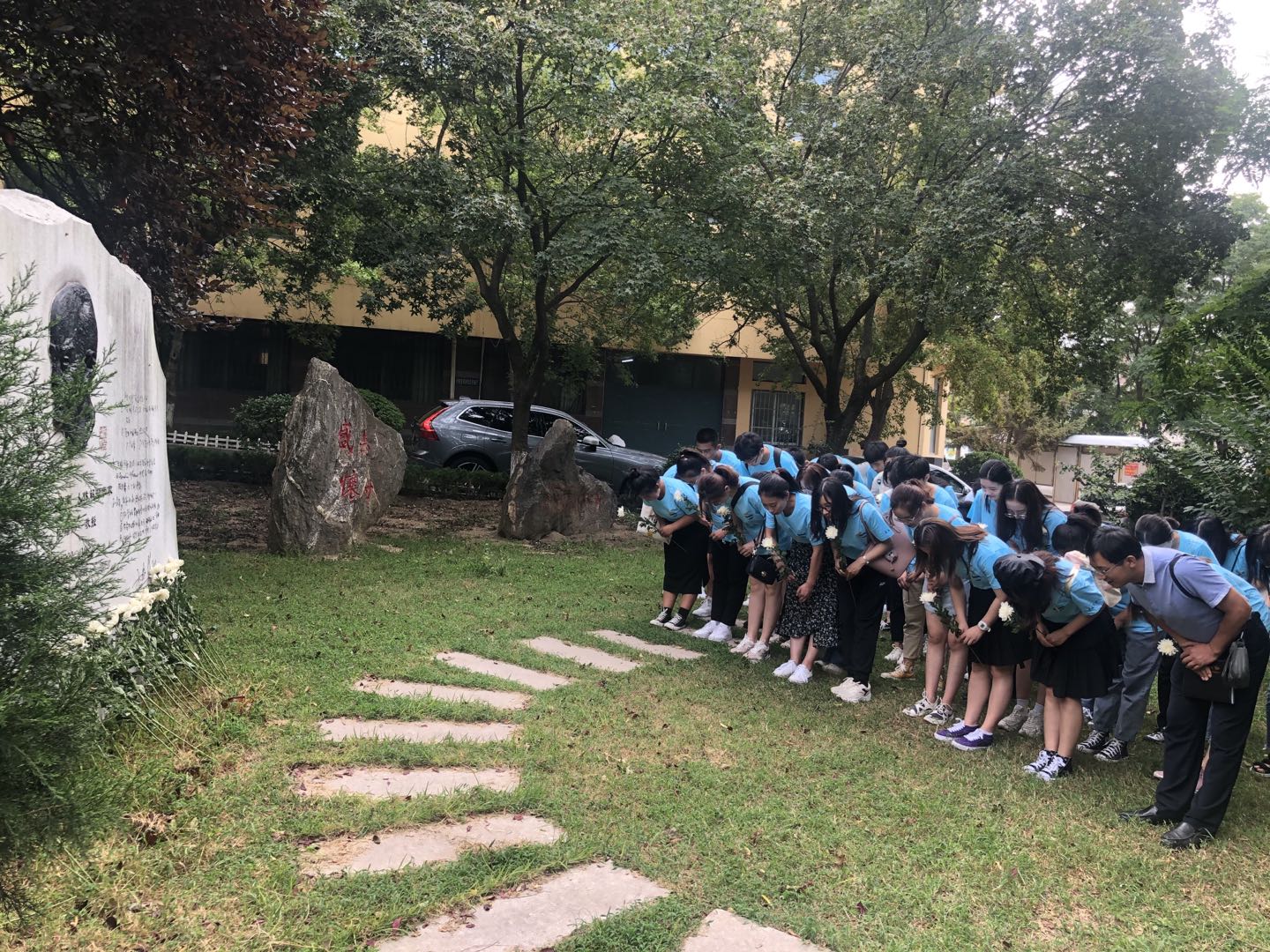 为保证学习效果,现场参观学习分两组交叉进行,每组35人。一组首先参观了青岛大学校史馆,学生志愿者向研究生们介绍青岛大学的发展历程及学校在教学、育人、科研、社会服务、基本建设、国际交流等方面取得的成绩。二组来到沈福彭教授石碑前,辅导员谭雪梅老师向同学们简单介绍了沈福彭教授的事迹及石碑上的文字。沈福彭教授“鞠躬尽瘁,死而不已”的精神感动和激励着无数青医人奋发向上、无私奉献,同学们也深受感染,全体同学向沈福彭教授鞠躬并敬献鲜花。