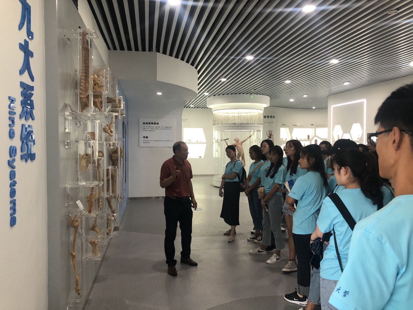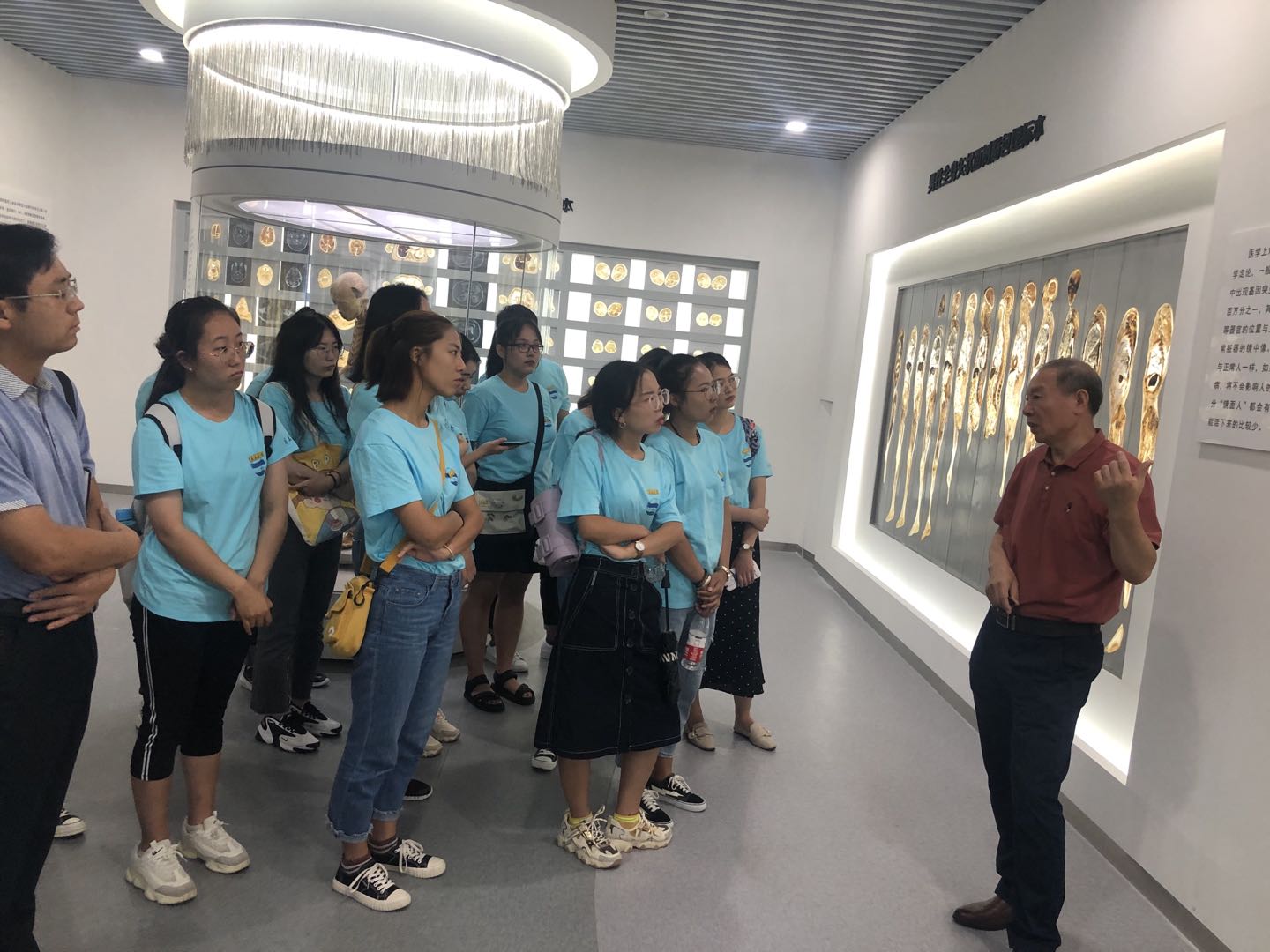 在人体生命馆,王守彪教授为同学们做现场教学。王教授曾是沈福彭教授的同事,从事人体解剖学教学工作多年,深受同学们喜爱。王教授向同学们详细介绍了胚胎发育、九大系统、头颈、四肢、躯干各部分结构的表面及层次解剖、病理解剖及标本的制作过程。在讲到脊柱、关节及心脏、肺、肾脏等器官时,王教授结合沈福彭教授的事迹和他所患疾病的症状与病理解剖进行讲解。沈教授少年时患脊椎骨结核卧床四年,而心、肺、肾均患有严重疾病,左眼几乎失明,备课看书要借助放大镜,但是他还是全身心地投入教学、科研和师资培养工作,甘为“人梯”。即使在逝世当天,上午他还和王沪祥副教授畅谈他对教学改革的设想,和当时还是青年教师的王守彪教授谈论教学工作,下午还接待了80级研究生。而早在1980年10月,当他意识到自己在世的时间不会太长时,便做出了捐献遗体的决定,并亲手写下了《我的解剖重点》,详细记载了他一生的病史和各器官的病变,还具体交待了解剖和制作标本的方法,写到眼疾处,还特别注明“角膜可用”。看着眼前的这些标本,听着王守彪教授的讲解,现场所有人无不被沈教授毫不利己、无私奉献的精神所打动,为沈教授“鞠躬尽瘁,死而不已”的精神所震撼。在讲到生殖系统处,王教授还传授给大家记忆口诀,让同学们再次温习的解剖结构。先进的3D 数字解剖教学台、工程浩大断层解剖标本、珍贵的镜面人标本、纷繁复杂的动脉铸形等,让同学们感受到了生命的珍贵和老一辈青医人积极探索、无私奉献的精神。