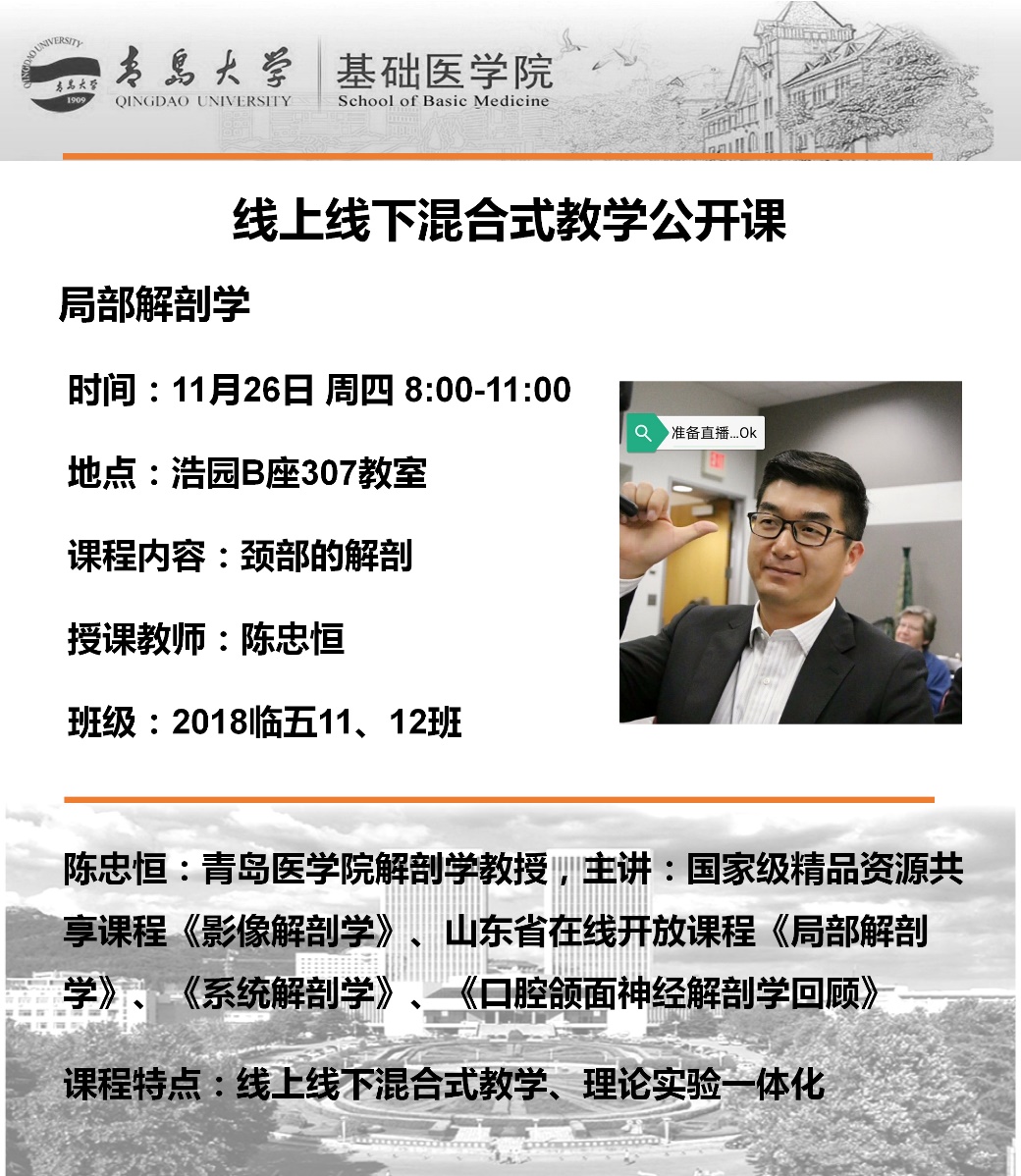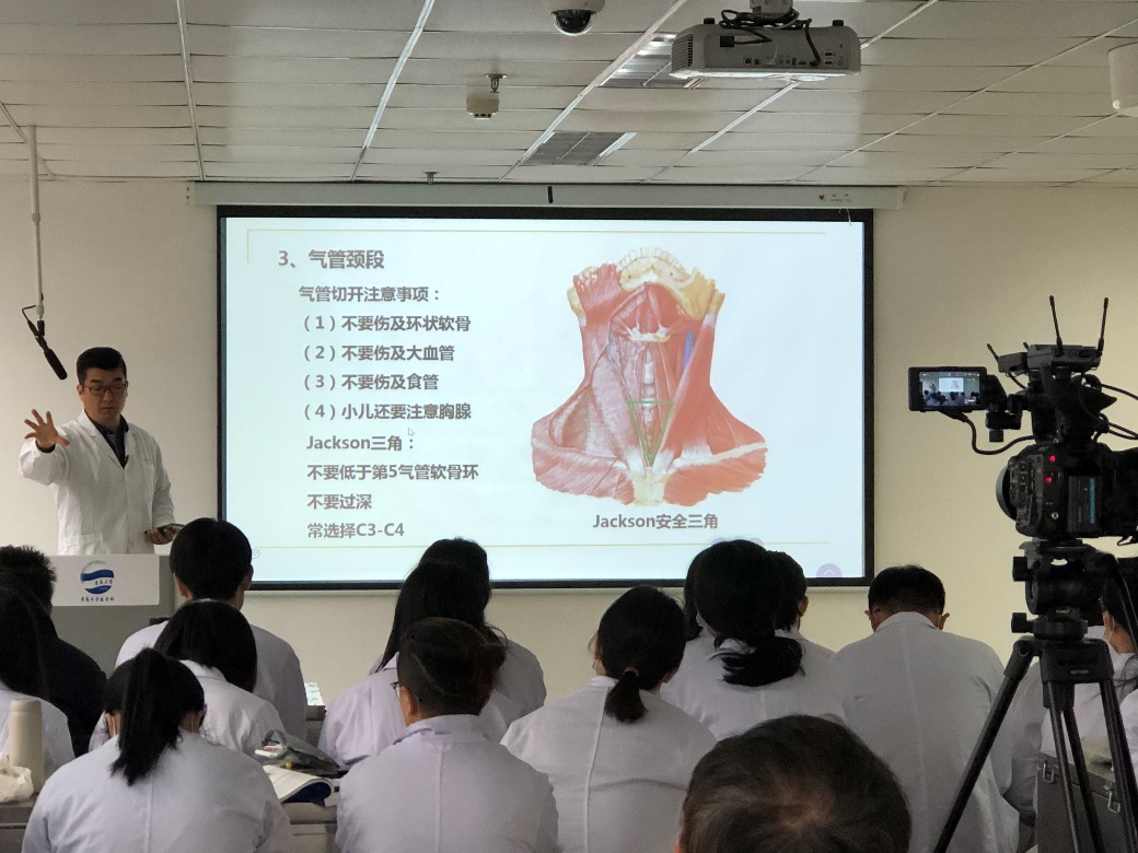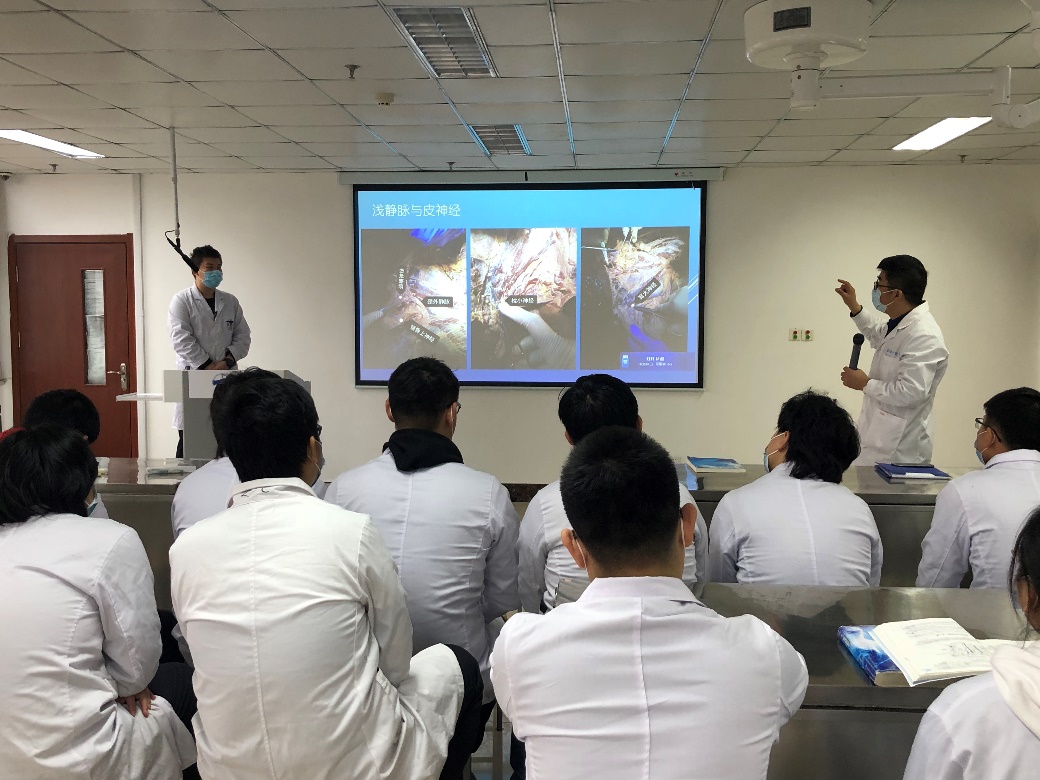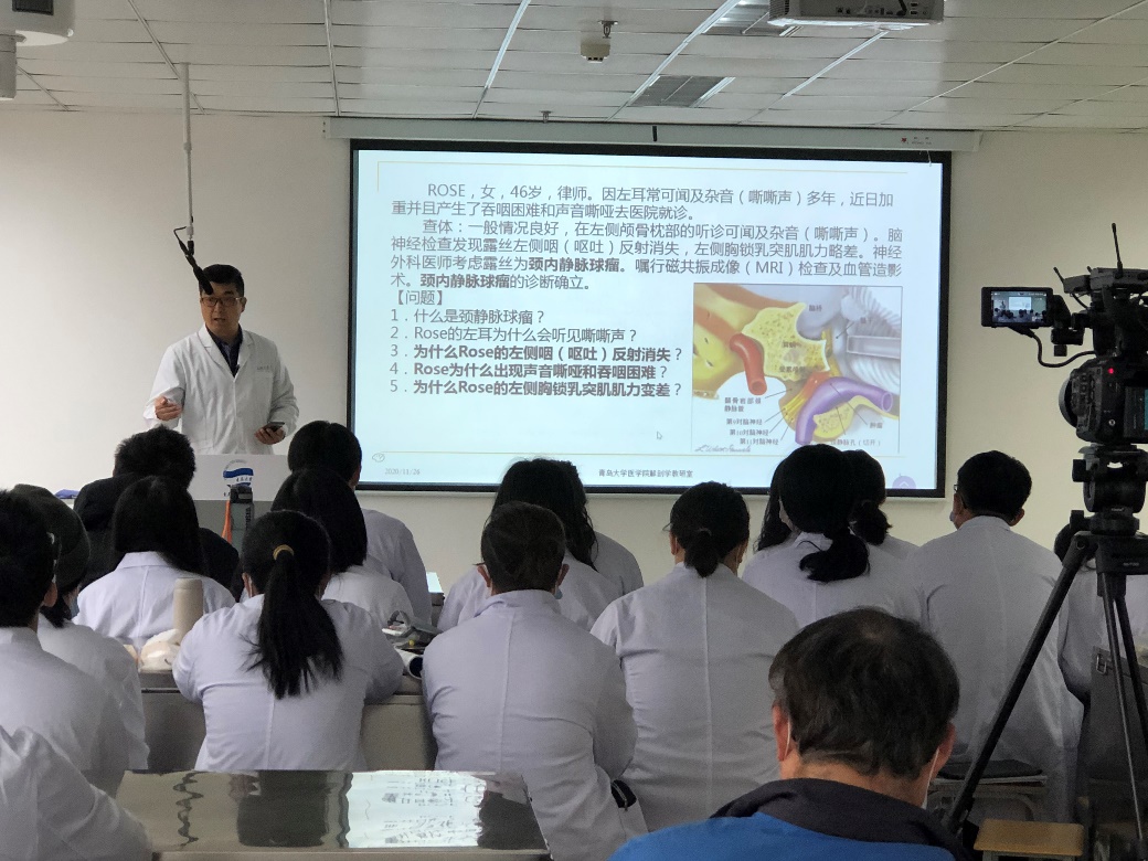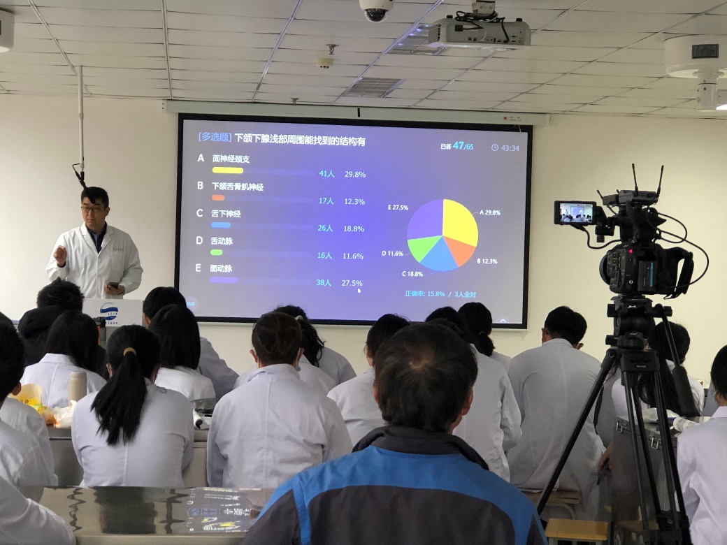 在浩园307举办了“线上线下混合式”教学公开课。人体解剖与组织胚胎学系陈忠恒教授讲授了《颈部的解剖》公开课,2018级临床五年制11班、12班全体学生参加了线下教学。