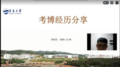 目前在山东大学读博士的刘丙岩同学曾是我院细胞生物学专业的优秀毕业生,先后跟随李玲和王建勋两位教授学习,研究生期间曾经发表两篇SCI论文,曾获得研究生国家奖学金、山东省优秀毕业生、青岛大学优秀学位论文等多个奖项。刘丙岩首先从自己考取复旦大学博士研究生失败的经历讲起,提醒同学们要多做准备工作,提取联系导师;全面参与科研活动,不要只专注于SCI论文。他和大家谈起自己成功通过山东大学博士研究生考试,正是得益于提前联系导师,与导师沟通交流比较多,同时自己的SCI论文发表比较早。他把自己的升学经验总结为三条:“首先最重要的是提前联系导师确定名额,确定导师意向;其次要尽早完成课题,尽早投稿,文章出的快就是优势;第三是不能“唯论文”论,要全方面发展自己。”