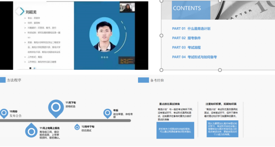 刘超龙从什么是青选计划、报考条件、考试流程、考试形式与如何准备等方面入手,为大家详细介绍了自己的备考经验。他特别提醒大家“青选计划”与一般的考试有所不同,没有笔试环节,因此重点应放在面试准备上。但这并不意味着对理论知识学习降低要求,在日常生活中一定要注重积累:关注时事新闻,掌握国家对基层工作的相关政策,学习党和国家领导人对青年人提出的要求。同时要克服紧张心理,加强模拟训练,要克服“懒惰”关。他说“大家认真研究一下近五年山东省选调生面试真题,以此来把握命题人的出题方向和侧重点;在考前做大量的练习,比如找自己熟悉的同学模拟考官,当着自己的同学把自己在表达方面存在的问题一点一点地克服,通过对着镜子找自己的仪表问题,通过录音找自己的语气表达问题等等来提升自己”,让同学们深受启发。