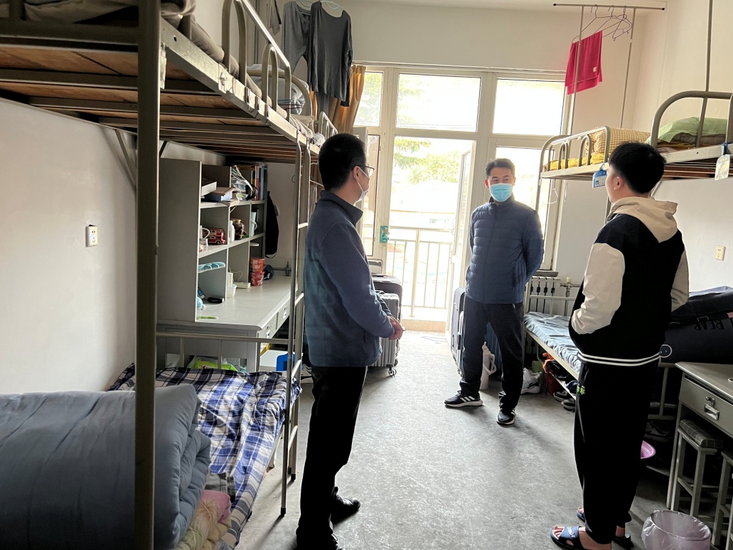 领导及辅导员谭雪梅深入宿舍,看望走访浮山校区和松山校区学生,检查疫情防控措施落实情况。