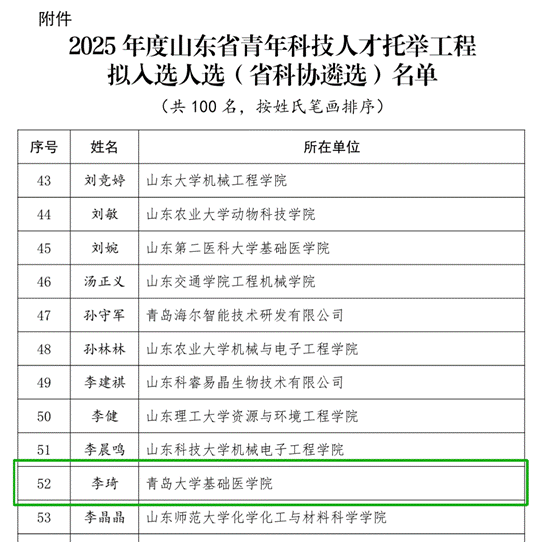 近日,山东省科学技术协会公示了2025年山东省青年科技人才托举工程拟入选名单。全省共100名青年科技人才在列,我院医学药理学系李琦老师入选。