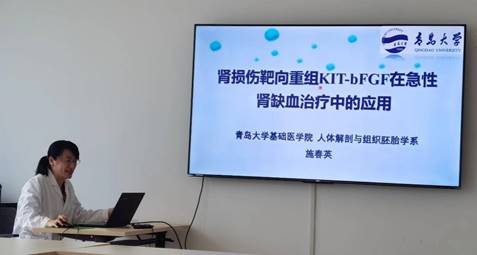 解剖与组织胚胎学系副教授施春英老师做了题为《肾损伤靶向重组KIT-bFGF在急性肾缺血治疗中的应用》的学术报告,分享了近期的研究成果。课题组通过基因工程设计构建重组KIT-bFGF可特异性靶向结合于肾损伤后的肾小管上皮细胞。相比天然bFGF, KIT-bFGF能够更有效抑制肾小管细胞凋亡、减轻缺血肾组织损伤、减少肾组织纤维化面积并且能够促进肾脏功能恢复。