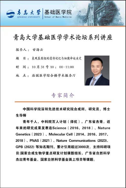 深圳先进技术研究院甘海云研究员于医学部综合楼学术报告厅作题为“表观基因组的遺传记记与细胞命运决定”的学术报告。李尚勇副院长参加并主持会议,相关专业的博士与硕士研究生参会学习。
