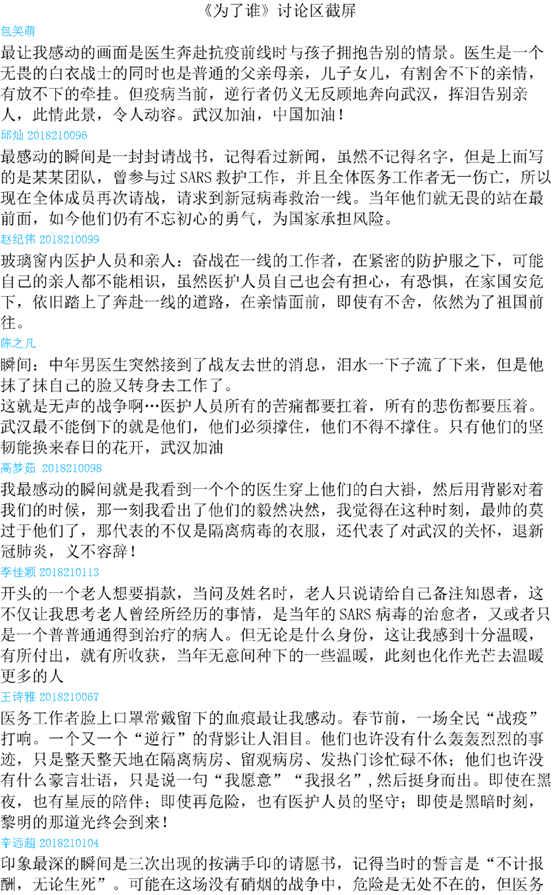教学案例:播放祖海(武汉版)MV《为了谁》,播放前预留问题:在观看的同时,最让你感动的瞬间是哪个,你有何感想?请在讨论区留言。