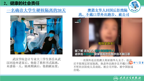 在讲述健康的社会责任时,通过视频的形式展现新冠肺炎疫情中两个案例,形成鲜明对比,引导同学们理解社会责任的内涵。