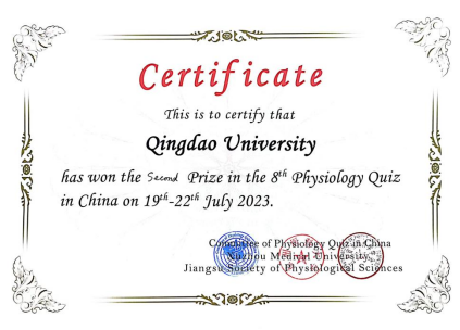 临床医学(5+3)学生王昕宇、刘思佳,临床医学五年制学生王雨萱、马雅轩、赵宏娇、金婉莹共六名同学组成两支参赛队伍参加了比赛,取得优异成绩。在笔试中,金婉莹同学获二等奖,其他五名同学获三等奖。在口试比赛中,青岛大学代表队荣获团体二等奖。生理学课程组王俊老师和陈曦老师获优秀指导教师二等奖。