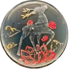 微观世界形形色色,微生物培养物的形态也千奇百怪,自然界微观也蕴藏着无限的美,一个培养皿以微生物为墨彩就能绘制成一个美轮美奂的微观世界。然而,用动态变化的微生物在柔软的培养基上作画就更加困难。本次是我院初次组织参加类似比赛,师生均缺乏经验,困难重重。为了抓住平皿上的那一抹美,同学们牺牲课余及节假日,在指导老师的陪伴下,边学习边创作,不断尝试不同菌株的培养条件,研究其色素、菌落特征,练习手法和技巧。经过师生的共同努力冲击决赛,最终2021级临床医学8班蔡淑文、唐毅云同学的作品《一鹿生花》获得团体组二等奖,2021级临床医学5班孙玉歆、戴玮同学的作品《京剧兔》获得团体组优秀奖。