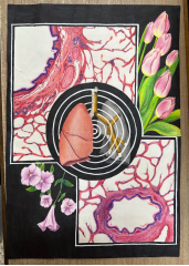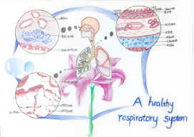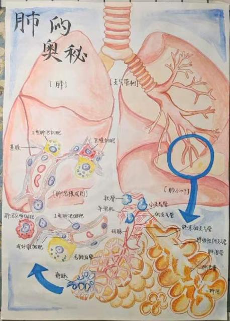 作品说明:本作品展示了一个健康的人体呼吸系统,让生命之花于呼吸中绽放,赋予其新的生命之美与满满活力。采用彩铅生动形象绘制了镜下的鼻黏膜,气管,肺泡的结构,并对假复层纤毛柱状上皮,静脉丛等关键结构加以中文注解,色彩丰富而又富有科学性、教育性,令人陶醉于“组胚艺术”的无穷魅力。正因有由微观至宏观的有序健康的结构,才促成一次次健康的一呼一吸。这幅画不仅是对人体呼吸系统的科学展示,更是对生命与自然的深刻思考。 |