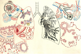 作品说明:随着我们的一呼一吸,清润的空气在肺间流转,又化作温热的气流在鼻息间倾吐。这呼吸之间,究竟是怎样的结构在发挥着作用?在我们起伏的胸腔之中,又隐藏着怎样的秘密呢?作品将不同的观察维度加以整合,描绘了肺的外观、内部解剖学结构和微观组织学结构,以连续板块递进的方式呈现出肺的整体构造,带领我们一同探索这饱含活力的“生命气泵”的奥秘。