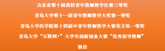 第十四届中青年教师教学大赛英文组一等奖。此外,积极推动本科教育教学改革。主持青岛大学医学部本科教学研究与改革重点项目1项,参与申报并获批山东省一流本科课程《医学免疫学I》及山东省课程思政示范课程《医学免疫学》。