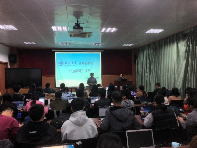 2018年11月28日晚,由6686体育官网 主办、6686体育官网 研究生会承办的“文献检索”系列讲座第一场在博雅楼103会议室举行。讲座由6686体育 党委副书记戚昕主持、青岛大学图书馆刘宁老师主讲,2018级医学部近百名研究生参加讲座。