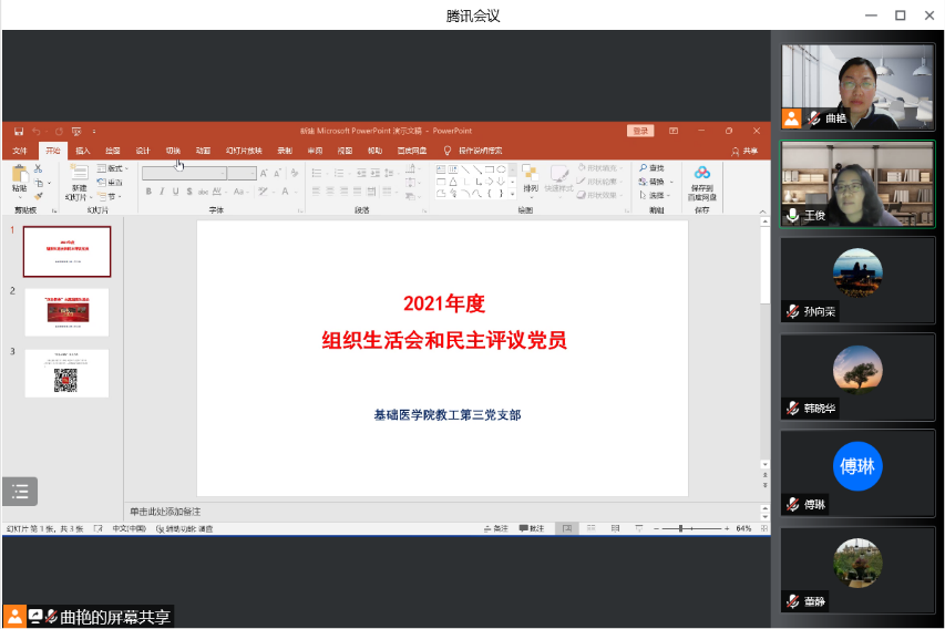 基础医学教工第三党支部目前共有党员12名。按照上级党总支部署要求,党支部于2022年3月30日围绕“深入学习贯彻习近平新时代中国特色社会主义思想,学习贯彻党的十九届六中全会精神”主题,精心组织筹备了这次专题组织生活会。支部书记王俊代表党支部委员会向党员报告2021年党支部工作情况,并通报党支部委员会检视问题情况。支部成员进行了民主评议,批评和自我批评,开展谈心谈话,深入查找问题,研究制定整改措施,明确了努力方向。