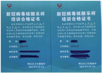 教工第一党支部助力核酸检测工作。8月26日,收到“青岛大学医学部关于招募核酸采样志愿者(首轮)的通知”,支部党员纷纷报名接受培训。9月3日,接到核酸检测通知,很快组建了志愿队和候补队。9月7日早8点半,志愿队准时在会议中心一楼采样点集合,开展全员核酸检测志愿服务工作。首先,按照培训要求的一级防护标准穿隔离衣、戴手套、戴口罩、戴帽子。然后熟悉流程。接下来分组,第一组老师和学生志愿者们一起,在入门处分流检测人群到五个队伍,义务提供口罩给佩戴不合格的受检者,第二组老师和学生志愿者在出口处负责信息登记、管理受检者出检方向、为登记员们补充并整理咽拭子和手消等耗材用品。下午4点半,志愿队统一按照一级防护用品穿脱流程结束工作。