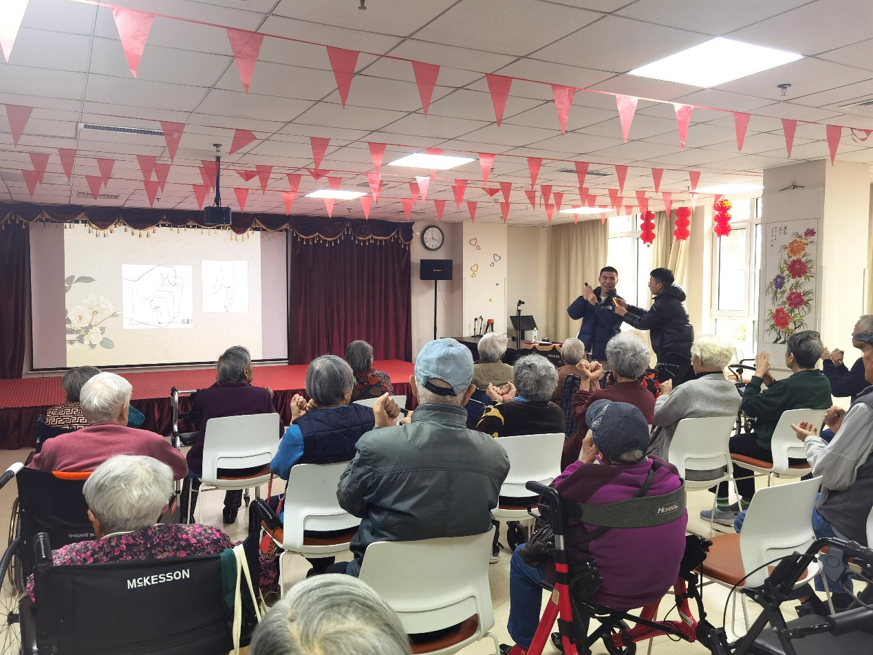 随后,“康健同行,筑基讲堂”环节拉开帷幕,学生志愿者李硕带领老人们体验了一场生动的保健操课程。他细致阐述了经络拍打的基本原理及实施步骤,指导老人们通过轻拍身体特定区域,以促进血液循环、疏通经络,从而增强体质,防病于未然。在李硕的耐心指导下,老人们积极参与,认真模仿每一个动作,脸上洋溢出幸福的笑容。老人们不仅掌握了实用的保健技巧,更深切感受到了青年志愿者的温暖与关怀。