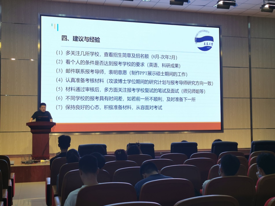 张浩分享了自己考博的经验,鼓励同学们要志存高远,在完成已有课题的同时做好规划,脚踏实地,在硕士期间多发表高水平论文,加强英语方面的学习,全面发展,坚定方向早做准备。
