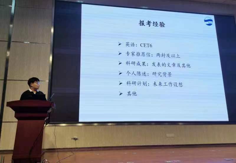冯振东同学从往届研究生考博就业情况、为什么要考博、怎么考博三方面进行阐述。他说读博有助于学生提高自身知识水平和能力,希望师弟师妹们在硕士阶段积极参与学术科研项目和课题,发表高水平论文,尽早树立目标选好方向,定期与导师交流汇报。