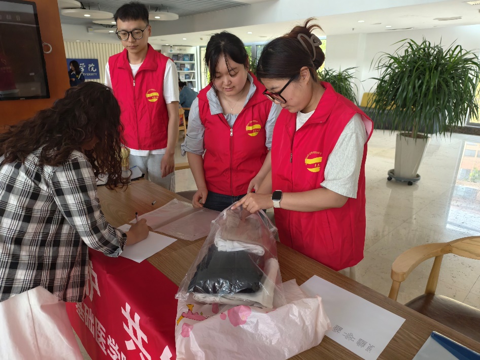 筑基志愿服务团在浩园医学教育综合楼大厅开展爱心回收捐赠活动,师生们以衣为媒,为偏远山区儿童送去温暖与关怀。