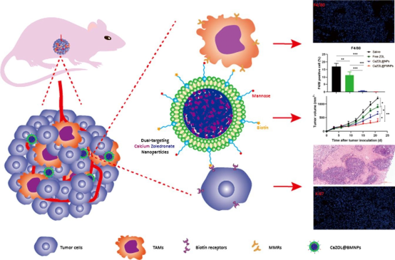肿瘤相关巨噬细胞(TAMs)肿瘤微环境中扮演多种重要作用,主要包括促进血管新生、肿瘤侵袭与转移同时可产生免疫抑制促进肿瘤细胞免疫逃逸,因此其可作为肿瘤免疫治疗的重要靶点。本文作者构建唑来膦酸递药系统用于靶向清除肿瘤细胞与TAMs,对其体内外抑制肿瘤效果进行考察。结果表明该递药系统可有效耗竭肿瘤微环境中的TAMs,减少肿瘤血管密度和调控肿瘤免疫抑制微环境,最终抑制肿瘤生长。本研究的结果为肿瘤免疫治疗与药物递送等相关研究提供参考与借鉴。