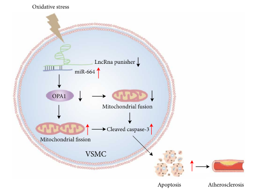 本研究发现,在动脉粥样硬化中,长链非编码核酸Punisher作为一种内源竞争RNA,直接与miR-664a-5p结合,调节其靶蛋白-线粒体嵴重塑蛋白OPA1,从而调节过氧化氢诱导的血管平滑肌细胞线粒体分裂,进而调控血管平滑肌细胞的生物学功能。这些实验结果与动脉粥样硬化患者的临床评估结果一致。本研究的数据揭示了线粒体蛋白OPA1、线粒体稳态、血管平滑肌细胞凋亡和动脉粥样硬化之间的重要关系,可为更好地阐明线粒体网络的复杂调控机制提供新的线索,并为动脉粥样硬化的诊断和治疗的靶向性提供参考。