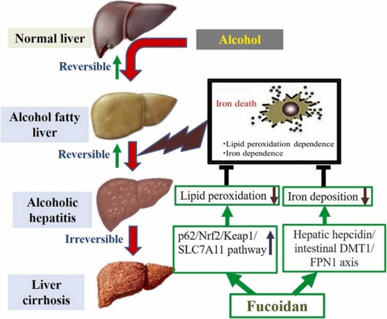岩藻多糖(Fucoidan)是一种海洋来源的硫酸化多糖,近年来因其广泛的生物学活性而备受关注。该研究探讨了岩藻多糖对酒精暴露大鼠铁过载和铁死亡所致肝损伤的保护作用及机制。结果发现岩藻多糖干预抑制肝脏氧化应激,逆转了酒精暴露引起的ALT和GGT升高。长期饮酒可导致血清铁蛋白、肝脏总铁和游离铁水平异常升高,肝组织出现铁死亡改变。补充岩藻多糖可通过调节肝脏Hepcidin-肠DMT1/FPN1轴抑制铁过载,上调p62/Nrf2/SLC7A11通路减轻肝脏氧化损伤,保护肝细胞免受长期酒精暴露所致的铁死亡损伤。进一步的非靶向代谢组学分析发现,酒精暴露大鼠的谷氨酸代谢、铁死亡、脂质代谢和自噬的代谢途径存在显著改变。岩藻多糖干预后降低了氧化型谷胱甘肽水平,调节磷脂酰乙醇胺水平,肝脏组织矿物质吸收、氨基酸合成途径和脂质代谢均发生改变。该研究从铁过载和铁死亡途径探讨岩藻多糖影响ALD进展的分子机制,将为早期防治ALD提供实验依据。