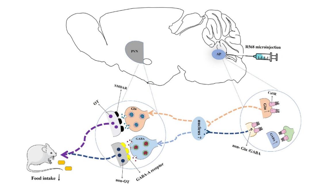 极后区(AP)位于第四脑室底部,缺乏血脑屏障,能敏锐的感知血液循环中化学物质的变化。钙敏感受体(CaSR)作为一种营养受体,在胃肠道有丰富表达,可被Ca2+和氨基酸激活,参与摄食调节。该研究发现,CaSR在AP也有大量表达。CaSR激动剂R568微量注射入AP抑制小鼠摄食量,下丘脑室旁核(PVN)参与该功能的调节。进一步研究发现,R568的作用与AP–PVN谷氨酸能和GABA能信号通路激活有关。其中,谷氨酸通路通过离子型谷氨酸受体(NMDAR)介导,促进室旁核催产素(OT)的合成;GABA通路则通过GABA-A受体参与调节但和OT的表达无关。该研究为干预和治疗与肥胖密切相关的代谢性疾病提供了新的思路。