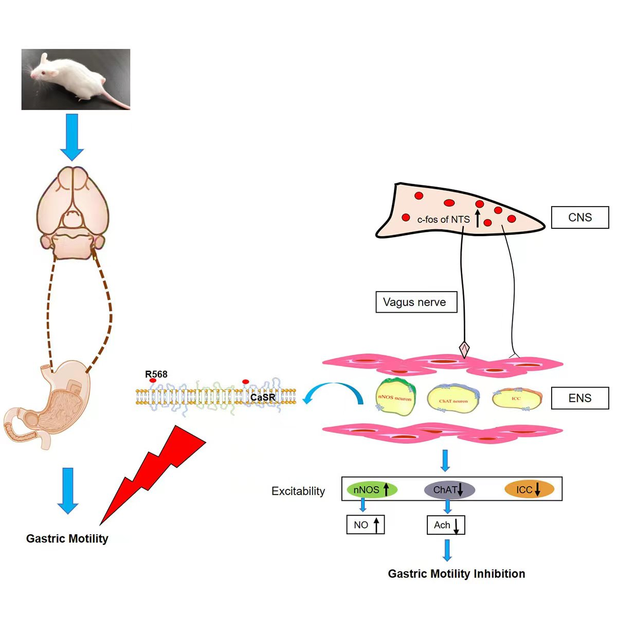 钙敏感受体(CaSR)是一种鸟嘌呤核苷酸结合蛋白(G蛋白)偶联受体,在消化道内表达很丰富,特别在胃肠道肠神经系统(ENS)中高表达。CaSR参与胃肠激素分泌,胃肠道体液转运,神经元突触传递,神经元生长发育的调节等。该研究发现激活胃肠道CaSR在体内外均能抑制胃动力。CaSR的激活抑制胃动力的机制与ENS胆碱能系统的抑制及氮能系统激活、增加迷走中枢的兴奋性、抑制ENS起搏Cajal细胞兴奋性有关。该研究为进一步了解CaSR在胃功能调节中的复杂作用提供了重要依据,有助于我们未来寻找治疗胃肠道疾病的新靶点。