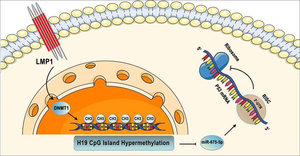 EB病毒(EBV)是与鼻咽癌、淋巴瘤、胃癌等人类肿瘤发生密切相关的DNA肿瘤病毒,其生命周期包括潜伏感染和裂解感染两种模式。p53蛋白作为关键的肿瘤抑制因子,参与调节多种病毒介导的致癌作用。本研究发现EBV编码的潜伏膜蛋白LMP1可通过诱导lncRNA H19启动子高甲基化,进而抑制H19和miR-675-5p的表达,并导致EBV相关胃癌和鼻咽癌细胞中的p53蛋白过表达,促进EBV在细胞中潜伏感染。研究结果揭示了LMP1调控p53蛋白表达的新机制,为进一步阐明LMP1和p53在EBV相关肿瘤中病毒潜伏感染及肿瘤发生发展中的作用提供了更为深入的理论依据。