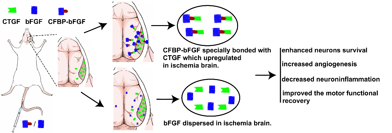 缺血性脑血管疾病严重威胁着人类健康,仍是全球范围导致死亡和长期残疾的重要原因之一。碱性成纤维生长因子(Basic fibroblast growth factor,bFGF)具有明确的神经保护作用并可有效促进血管再生。然而,bFGF难以特异性靶向递送到缺血脑组织,限制了它在脑缺血治疗中的应用。本研究中,我们设计制备了特异性靶向重组融合蛋白CFBP-bFGF。该重组蛋白可跨越血脑屏障,靶向结合于脑缺血组织中特异性上调的结缔组织生长因子(Connective tissue growth factor,CTGF),并可提高bFGF在缺血脑组织中的有效浓度,延长其作用时间。CFBP-bFGF可通过静脉给药的方式用于大鼠脑缺血的治疗,相比天然bFGF,CFBP-bFGF能够有效保护神经元、促进血管再生、减轻炎症反应,由此明显改善脑缺血损伤大鼠的运动功能。该研究为脑缺血的bFGF靶向治疗提供了具有临床应用潜力的新策略。