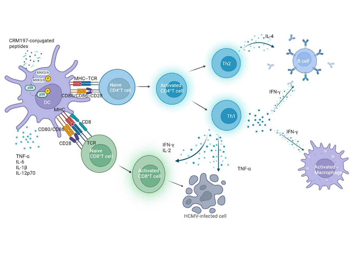 人类巨细胞病毒(HCMV)感染在世界范围内流行,目前尚无许可的HCMV疫苗来控制它。因此,开发一种有效的HCMV病毒疫苗是一个重要的优先事项。由于其优异的免疫原性,HCMV的关键成分,磷酸蛋白65(pp65)和糖蛋白H(gH)是HCMV疫苗设计的潜在靶蛋白。在这项研究中,我们预测并筛选了pp65和gH的B和T细胞的显性抗原表位,并将合成的多肽与载体蛋白交叉反应材料197(CRM197)偶联以制备三种肽-CRM197疫苗(pp65-CRM197、gH-CRM197和pp65-CRM197+gH-CRM197)。此外,我们还探讨了多肽-CRM197疫苗的免疫原性及其对树突状细胞(DCs)的影响。结果表明,三种多肽-CRM197疫苗可以通过p38 MAPK信号通路诱导DCs的成熟,并促进促炎因子如TNF-α和IL-6的释放。同时,多肽-CRM197疫苗能有效激活T细胞免疫和体液免疫,远优于HCMV灭活疫苗。总之,我们构建了三种多肽-CRM197疫苗,可以诱导多种免疫效应,为HCMV疫苗设计提供了一种新的方法。