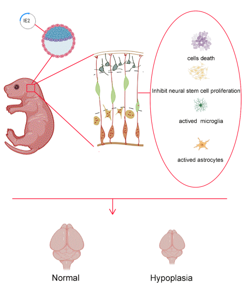 人类巨细胞病毒(HCMV)属于β疱疹病毒亚科,是一种在人群中广泛存在的人类病原体,可在感染个体中建立终身潜伏感染。全世界有0.5%-2%的新生儿受到先天性HCMV感染的影响,大约10%-15%的先天性感染新生儿在出生时有症状。另外90~95%宫内感染的新生儿出生后及围产期表观正常,但随着时间推移,出生后另有10~15%的宫内感染患儿以后可发展为小头畸形(HCMV先天性感染中显著的脑部疾病临床表现)、听力障碍、智力发育低下、脑室周围钙化。然而,由于物种隔离的限制,目前对于HCMV导致人类神经系统疾病的具体机制尚未清楚。近10年来转基因动物模型的建立,为在整体水平开展HCMV基因及其产物体内致病分子机制提供了在体模型。为了验证HCMV-IE2蛋白是否会导致体内神经发育过程的失调,构建了转基因小鼠(Rosa26-LSL-IE2+/−,Camk2α-Cre),它可以特异地稳定地在大脑中持续表达HCMV-IE2蛋白。这也为证实HCMV-IE2蛋白在体内对神经祖细胞正常发育的影响提供了可能。在本项研究中,发现HCMV-IE2蛋白可以诱导神经元的死亡,抑制神经祖细胞的增殖与分化,并激活小胶质细胞和星形胶质细胞的活化,打破神经内环境稳态平衡,最终导致小头畸形的发生。HCMV-IE2蛋白在神经系统中的持续表达导致神经系统的不可逆损伤。本研究在国际上首次报道HCMV-IE2蛋白促进转基因鼠神经元的凋亡,神经干细胞总数减少,并抑制神经干细胞的增殖分化,揭示HCMV-IE2蛋白导致转基因鼠小头畸形的分子机制,为阐明先天性HCMV感染致胎儿小头畸形及神经发育损伤的机制奠定了实验基础。