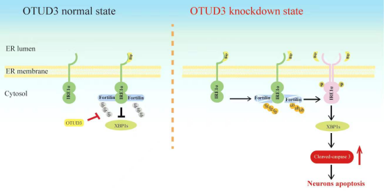 姜宏教授研究团队在前期的研究中发现,OTU结构域蛋白3(OTU domain-containing protein 3,OTUD3)敲除(OTUD3-/-)小鼠会出现运动缺陷和黑质纹状体多巴胺能神经元的损伤,但其损伤机制不明。OTUD3作为维持细胞内蛋白质稳态的重要调节因子是否参与调控内质网应激尚未见任何报道。因此,阐明OTUD3调控内质网应激的分子机制及其在黑质多巴胺能神经元损伤中的作用,对揭示PD的发病机制具有十分重要的意义。为了阐明OTUD3参与调控内质网应激的分子机制及其在多巴胺能神经元死亡中的作用,研究小组通过对OTUD3-/-小鼠多巴胺能神经元中内质网的形态和内质网应激标志蛋白的检测,观察到敲除OTUD3会诱导神经元发生内质网应激。Western blotting对小鼠黑质区内质网应激通路相关蛋白进行检测,结果发现,敲除OTUD3会激活内质网应激的IRE1α信号通路,同时,研究小组还发现OTUD3对IRE1α信号通路的调控是通过调节Fortilin蛋白的表达水平实现的。该研究表明,敲除OTUD3可能通过提高Fortilin蛋白的泛素化水平而激活IRE1α信号通路进而诱导多巴胺能神经元的凋亡,首次提出OTUD3可以参与调节内质网应激。 因此,抑制IRE1α信号通路的激活可作为解决OTUD3诱导的多巴胺能神经元死亡新的治疗靶点。