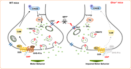 该研究应用动物及细胞模型,观察到黑质DA能神经元及PC-12细胞中存在GHS-R1a/D2R异源二聚体,且此异源二聚体的激活可以通过影响DA的合成促进黑质DA能神经元释放DA,机制可能与上调CaM介导的CREB信号通路,并提高CREB下游靶蛋白TH的表达有关。该研究旨在阐明GHS-R1a/D2R异源二聚体在PD发病中的作用及其可能的分子机制,揭示GHS-R1a参与调控DA能神经元功能的新途径,为PD的治疗提供新的药物靶点。