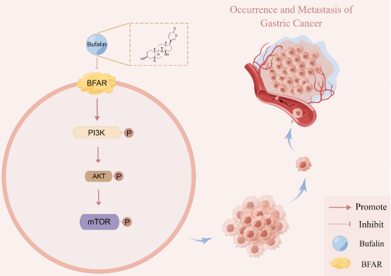本研究证实了双功能凋亡调节因子(bifunctional apoptosis regulator, BFAR)是蟾毒灵的直接相互作用蛋白,与蟾毒灵存在多个潜在的结合位点。BFAR在胃癌中高表达,对胃癌的诊断和预后具有重要意义。蟾毒灵在体内外通过逆转BFAR诱导的PI3K/AKT/mTOR信号通路激活抑制胃癌的发生和进展。本研究将为蟾毒灵作为胃癌的临床治疗药物提供理论证据,为BFAR作为胃癌早期诊断和预后标志物提供新思路。