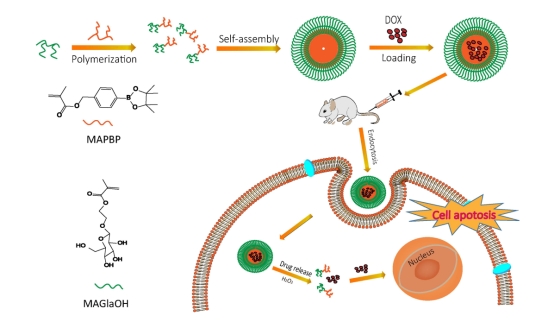 该团队成功地开发了半乳糖修饰的靶向递送阿霉素(DOX)的纳米胶束(DOX@NPs),该纳米胶束可通过甘露糖修饰主动靶向甘露糖受体阳性的4T1和MDA-MB-231细胞同时响应肿瘤细胞内高浓度的活性氧(ROS)加速DOX的释放。结果表明DOX@NPs在体外可以有效诱导肿瘤细胞凋亡和周期阻滞,在4T1肿瘤小鼠模型中,纳米胶束能有效积累在肿瘤部位,抑制肿瘤生长,且无不良副作用,这为其进一步发展成为一种有前途的化疗药物递送系统铺平了道路。