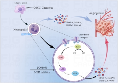 口腔鳞状细胞癌(OSCC)是口腔最常见的恶性肿瘤。肿瘤血管生成在肿瘤进展中起着至关重要的作用。本研究中首先利用免疫组化技术评估了OSSC内中性粒细胞计数联合MVD预测患者生存时间的准确性及其与临床病理参数和预后的关系。体外实验中探讨了Chemerin-中性粒细胞相互作用对HUVECs血管生成功能的影响。在OSCC中,Chemerin过表达通过中性粒细胞促进了HUVECs血管生成。同时Chemerin通过激活MEK/ERK信号通路,上调中性粒细胞内的促血管生成因子(如VEGF-A、MMP-9、MMP-2和S100A9)的表达。体内实验显示:Chemerin可能通过调节肿瘤血管生成来促进肿瘤的生长。综上所述,中性粒细胞计数和MVD是影响OSCC患者预后的不良因素,两者联合是预测OSCC患者生存时间更有效的因素。中性粒细胞可能通过Chemerin及MEK/ERK信号通路促进血管生成,并参与OSCC的进展和转移。