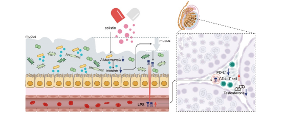 团队前期研究发现,窄谱抗生素粘菌素可以通过下调雄性小鼠的睾酮水平,显著提高抗PD-L1的抗肿瘤效率。然而,粘杆菌素调节睾酮的潜在机制尚未被研究。本研究发现粘菌素可以显著下调睾丸中PD-L1的表达,增强CD4+ T细胞的浸润,表明粘杆菌素对睾丸免疫抑制微环境产生影响。进一步的研究发现,粘菌素可以相对选择性地降低Akkermansia的丰度,并减少肌苷的产生。口服补充肌苷可以减轻粘菌素引起的结肠黏液层厚度的改变,恢复正常的血清LPS水平。此外,肌苷补充可促进睾丸中PD-L1表达和睾酮分泌的恢复。本研究发现揭示了肠道菌群调节宿主睾酮分泌的新途径。