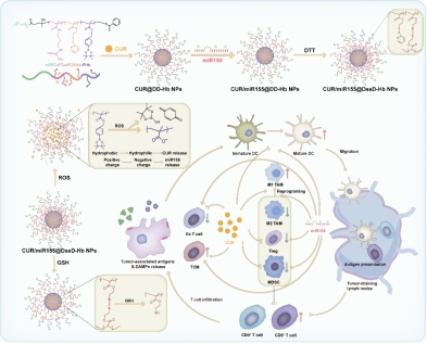 miR-155越来越多地被用于癌症免疫治疗。树突状细胞(DC)中miR-155水平升高表明可增强其成熟、迁移、细胞因子分泌及促进T细胞活化的能力。此外,M2巨噬细胞中miR -155的过表达促进其向M1表型的极化。然而,miR-155可诱导免疫抑制细胞的募集,如调节性T细胞(Treg)和髓源性抑制细胞(MDSC)。姜黄素(CUR)可促进调节性T细胞(Treg)转变为Th1细胞,促进M2肿瘤相关巨噬细胞(TAM)向M1表型的极化,并阻止MDSC在肿瘤微环境中的募集。但是CUR可通过阻碍成熟标志物和细胞因子等的表达对DC施加免疫抑制影响,从而阻止DC对免疫刺激剂的应答。因此,设计了活性氧/谷胱甘肽双重响应药物递送系统(CUR/miR-155@DssD-Hb NPs)用于递送CUR和miR-155。体内外实验结果表明,CUR/miR-155@DssD-Hb NPs可有效抑制4T1和B16-F10肿瘤细胞的活力,触发损伤相关分子模式(DAMPs)的释放,刺激DC成熟,随后激活CD 8+ T细胞,减少免疫抑制细胞群(如MDSC、Treg、M2 TAM和耗竭T细胞),促进长期免疫力的形成并减少肺中转移性结节的形成并减少肺中转移性结节的形成。总之,CUR和miR-155的共递送系统(CUR/miR-155@DssD-Hb NP)显示出用于黑色素瘤和三阴性乳腺癌免疫治疗的潜力。