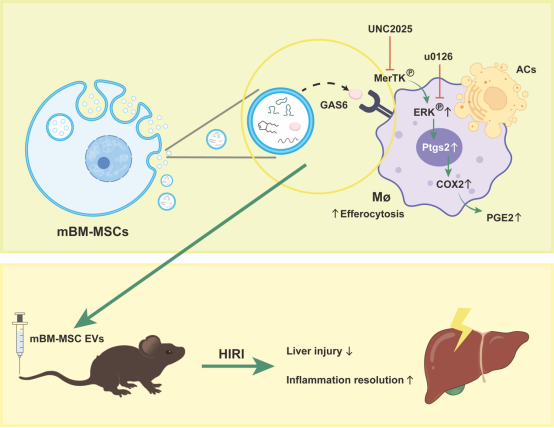 肝脏缺血再灌注损伤(HIRI)是肝移植和手术过程中常见的并发症,会导致肝组织损伤,甚至肝功能衰竭。尽管间充质干细胞衍生的细胞外囊泡(MSC-EVs)在多种器官缺血再灌注损伤(IRI)的细胞替代疗法中显示出巨大潜力,但其确切机制仍不清楚。该课题组构建小鼠70%肝缺血再灌注损伤模型,通过尾静脉注射MSC-EVs治疗后,可显著减轻缺血再灌注损伤;课题组构建了骨髓来源的巨噬细胞凋亡细胞共培养模型,利用蛋白质组学筛选,明确了MSC-EVs富集并携载GAS6激活巨噬细胞MerTK/ERK/COX2信号轴调控胞葬功能,进而促进肝损伤的修复。这为寻找治疗肝缺血再灌注损伤提供了新的治疗方法。